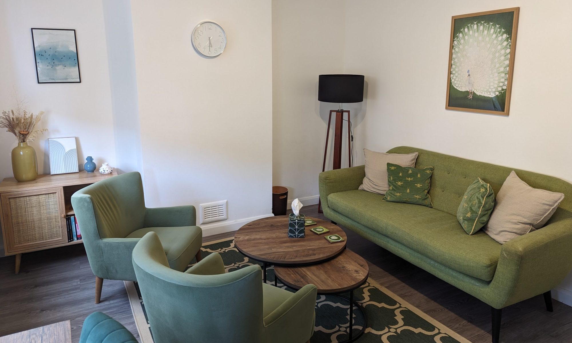 One of three first floor rooms at 10 Genotin Terrace, Bowlby is both modern and cosy. Three tub chairs are arranged around a fireplace giving it a homely feel. The room is suitable for work with individuals or couples.