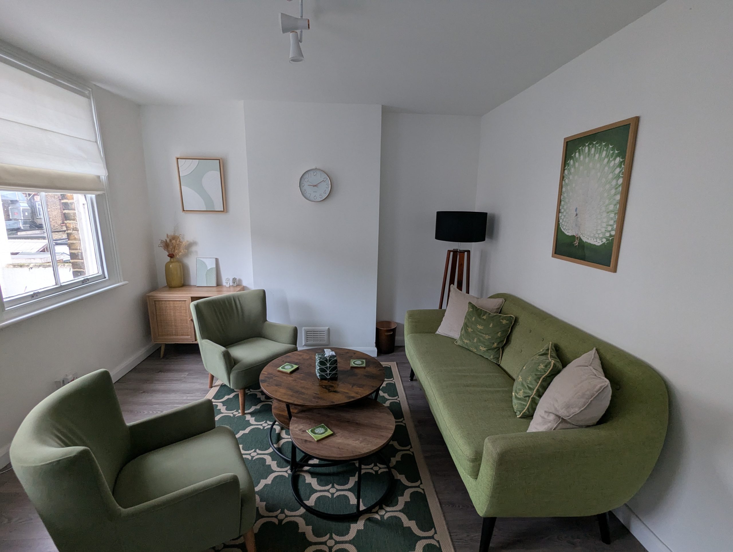 The largest of our talking therapy rooms at 10 Genotin Terrace, Klein is ideal for individual, couples or family therapy. This room is also furnished with a desk and chair ideal for remote working.